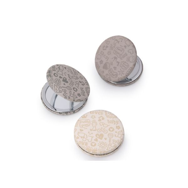 This compact PU mirror,outside with embossed patterns,Inside with two glass mirrors,one is regular,one is 2x magnification.You can change it in two pieces plane mirrors or magnifying mirror.